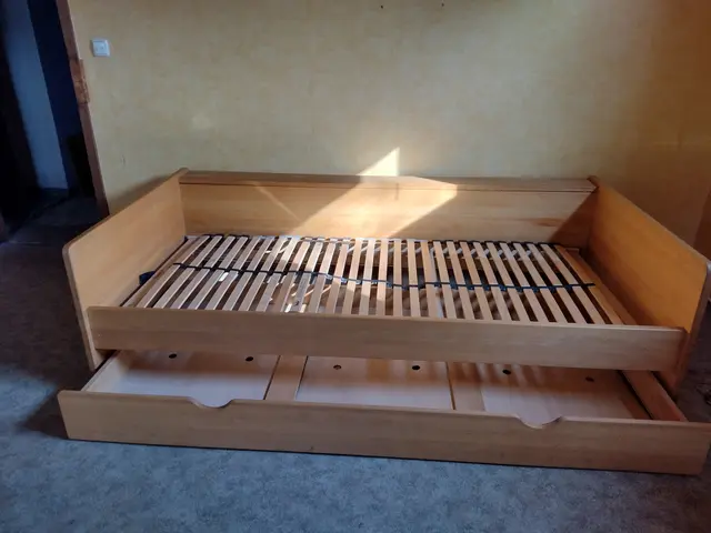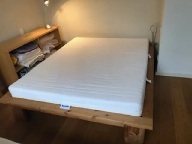 Das Bett ist insgesamt 1,80 m breit, Länge 2,20 m. Um die Matratze herum gibt es einen 10 cm breiten Holzrand (Rahmen aus Kiefernholz). Die Matratze ist 1,60 m breit, 2 m lang. Matratze: Dunlopillo, wegen sehr geringer Benutzung nicht durchgelegen un...