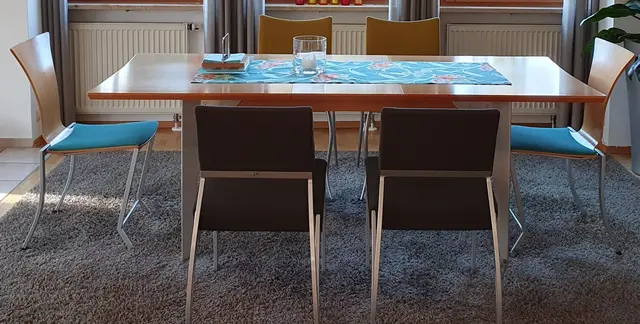 Design Klassiker von KFF: Esstisch, Buche, sehr praktisch ausziehbar, Länge 160/205/250 (2 Einlegeplatten innenliegend), Breite 90 cm. 6 Stühle, vor ein paar Jahren neu bezogen. Alles ist in gepflegtem gutem Zustand. Abholung in Eckenhaid.