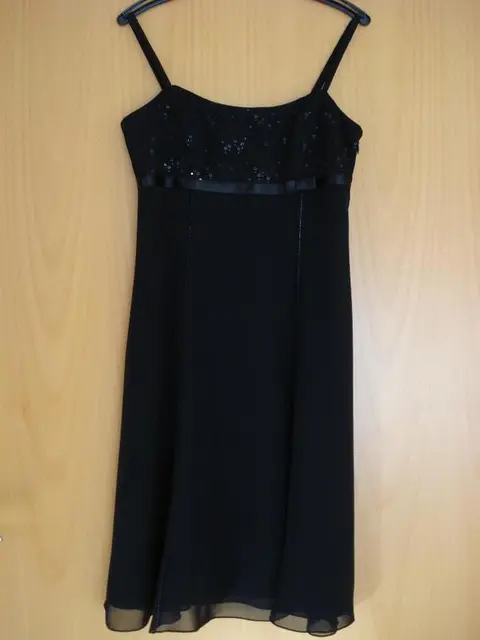 Firma Weise, Model 78.056.6, Gr. M (entspr. Gr. 164) - eleganter, matter schwarzer Chiffonstoff, Oberteil im Empire-Stil mit kleiner Schleife und Pailletten, Rock mit Ziernähten, verstellbare Träger, gefüttert, bei Murk in Wachenroth gekauft, wenig getragen (Konfirmation sowie Theaterbesuche), daher wie neu. Optional dazu: schwarzer BH mit abnehmbaren Trägern, Fa. BeeDees, Gr. 70A (4,90 Euro).