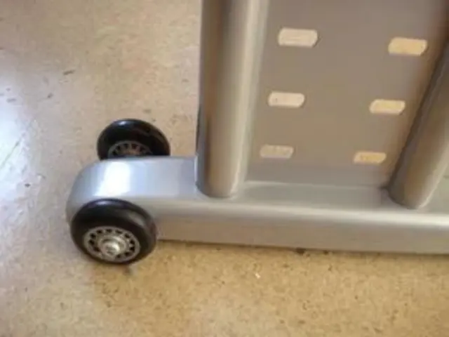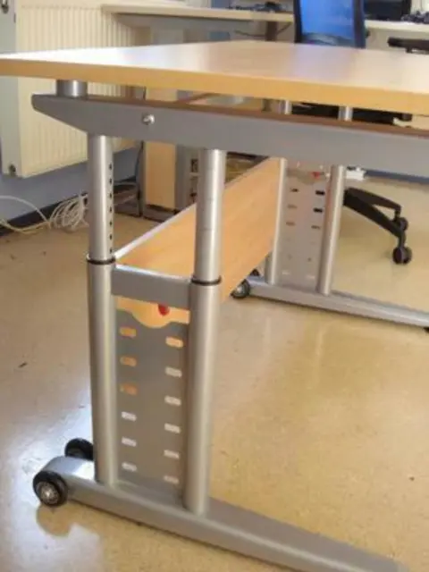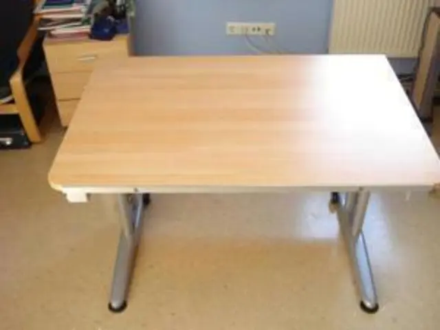 Hersteller Welle-Möbel, Programm ′All Around in Concept Marius′, Artikel-Nr. 78291, mitwachsender Schreibtisch mit Rollen, höhenverstellbar von 55-77 cm, Neigungsverstellung bis 45 Grad, C-Fußgestell weißaluminium lackiert, Platte Buche-Nachbildung, Breite 110 cm. Sehr gut erhalten.