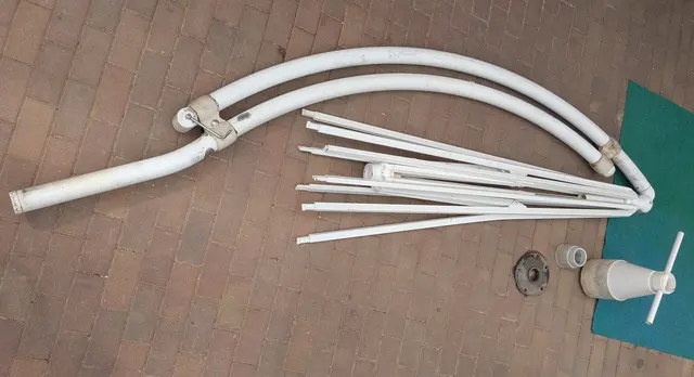 3,5 Meter Durchmesser, ohne Stoff, eine Strebe etwas verbogen, lässt sich problemlos aufspannen, Bremsbelag muss ersetzt werden (als Ersatzteil bei Sun Garden erhältlich). Zubehör siehe Foto. Reparaturanleitung vorhanden.