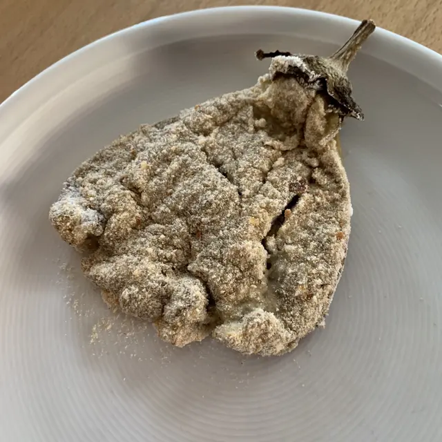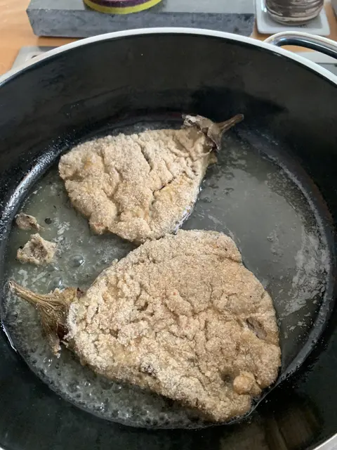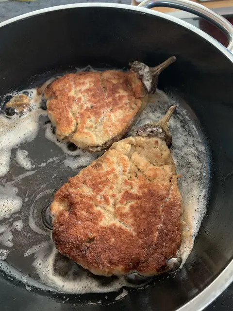 Den Ofen auf 210 Grad Heißluft vorheizen. Die Auberginen waschen und rundherum mit einer Gabel einstechen und im Ofen auf Backpapier für 50-70 Minuten garen bis sie braun, schrumpelig und weich sind. Aus dem Ofen nehmen, mit einem feuchten Tuch bedecken und etwas abkühlen lassen (bis man sie anfassen kann). Mit einem scharfen Messer die Schale am Stielansatz vorsichtig einschneiden und die Schale abziehen. Die Aubergine mit einer Gabel flach drücken. Erst im Mehl dann im Ei und dann in den Semmelbröseln wenden. In der Pfanne ausbraten bis sie braun und knusprig sind.