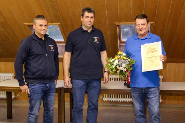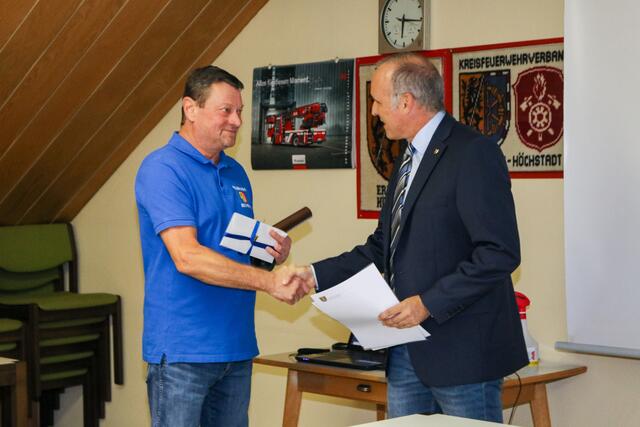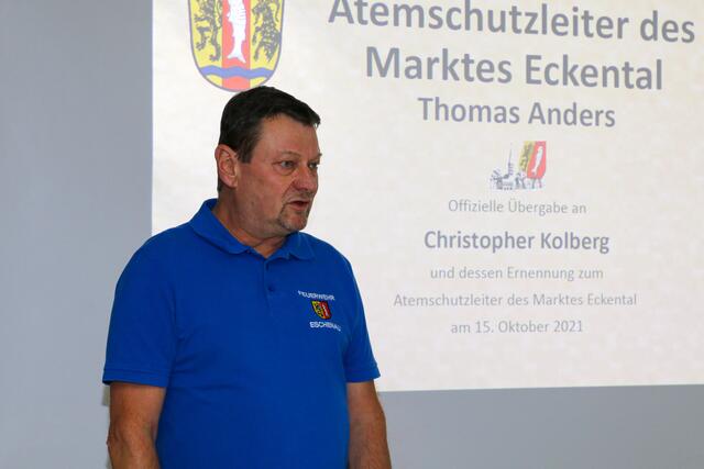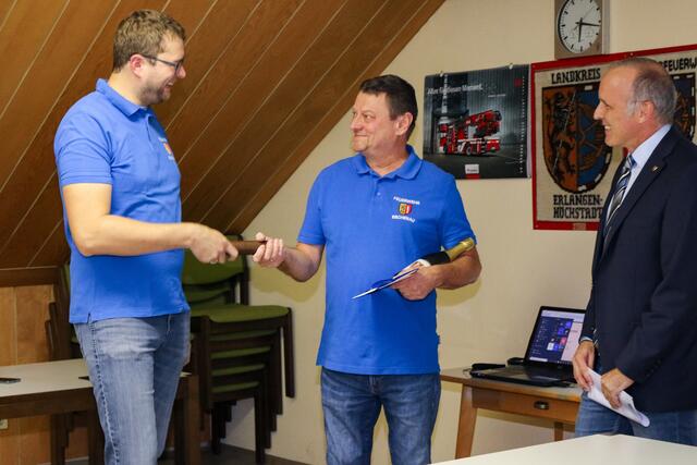 Es kam nicht nur zum sprichwörtlichen Generationenwechsel, er fand tatsächlich statt, denn Sohn Thomas bekam das Amt des Atemschutzleiters für den Markt Eckental von selbigen übertragen. 22 Jahre verstrichen inklusive vieler neuer Anforderungen und Änderungen im Feuerwehrwesen ebenso wie im Beruf oder im familiären Umfeld. Zuverlässig, kompetent und äußert flexibel erfüllte er die ihm übertragenen Aufgaben, in den letzten Jahren unterstützt von den Atemschutzbeauftragten der Wehren vor Ort. So ganz mag er sich jedoch noch nicht aus dem Geschäft zurückzuziehen, so bleibt er der Atemschutzwerkstatt bis auf weiteres erhalten, nur nicht mehr in führender Position. Diese stellte er zur Verfügung und in einer kleinen Festrunde wurde das Amt des Eckentaler Atemschutzleiters mit sofortiger Wirkung offiziell durch den 3. Bürgermeister Felix Zosel in die Hände von Christopher Kolberg gelegt.