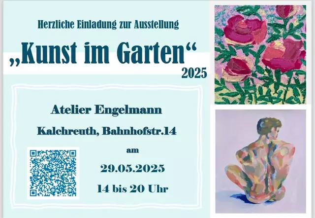 Am Donnerstag, 29. Mai, öffnet das Atelier Engelmann von 14-20 Uhr in der Bahnhofstraße 14 in Kalchreuth, die Gartenpforten und das Atelier für eine Kunstausstellung zwischen Obstbäumen und Blumenbeeten. Bereits das vierte Mal in Folge präsentiert das „Atelier Engelmann“ Werke von fünf verschiedenen Künstlern. Die Besucher sehen Acrylmalerei, Aquarelle, Zeichnungen, sowie Digital-Art. Für musikalische Untermalung ist gesorgt.