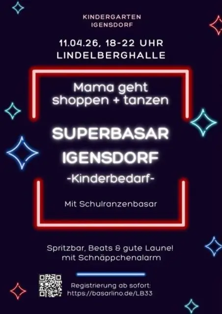 Der große Kinderbasar mit Kinderkleidung, Schuhen aber auch Umstandsmode, Spielzeug und vielem mehr. Vorsortierter Basar - einfach und unkompliziertes shoppen. Samstag 11.04.2026 von 18.00 Uhr bis 22.00 Uhr Lindelberghalle (Stöckach) zusätzlich mit Schulranzenbasar Dazu gibt`s eine Spritzbar, Beats und gute Laune. Natürlich nicht nur für Mama`s - alle sind herzlich eingeladen zum shoppen und feiern! Mehr Informationen findet ihr auf www.basarlino.de/LB33 Euer Elternbeirat Kindergarten St....